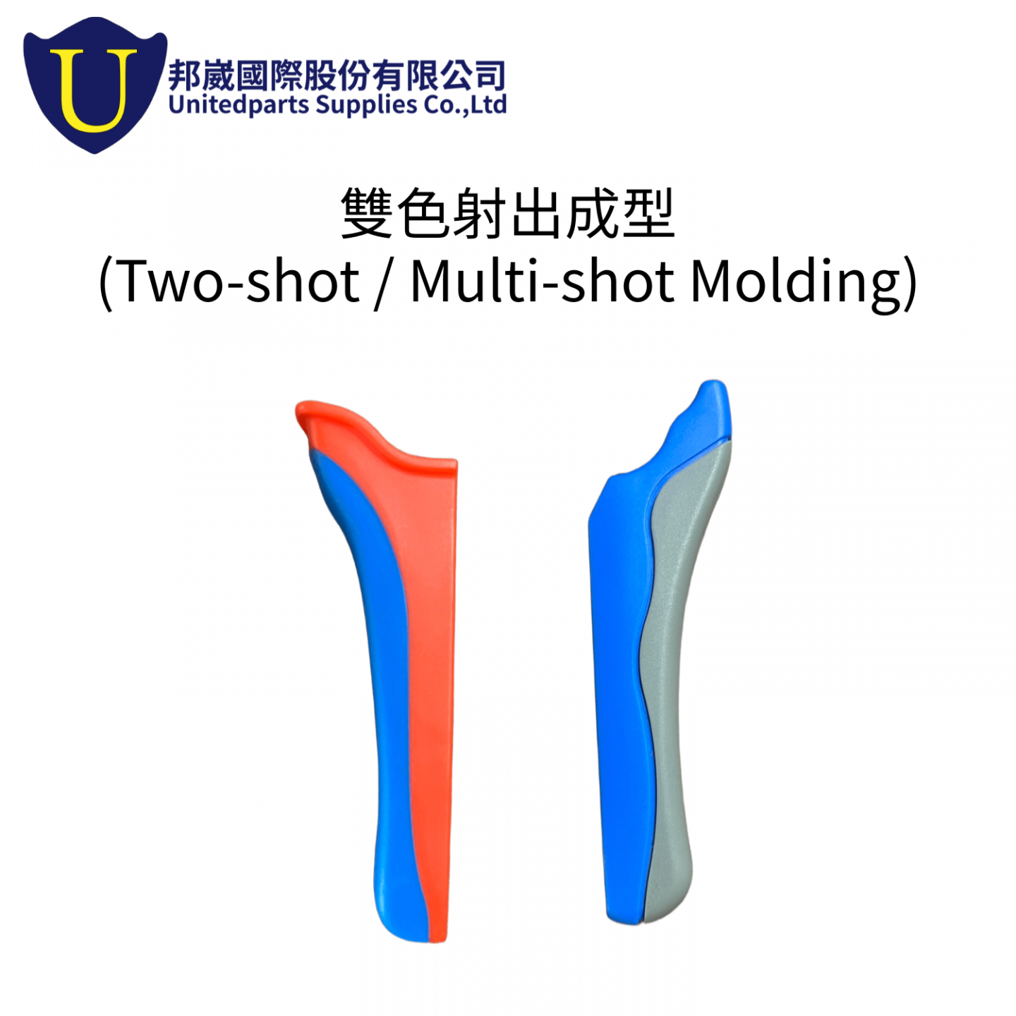 在同一模具中連續注入兩種不同塑膠材料或顏色,形成一體成型結構,常用於外觀件或需具備軟硬結合的產品,如手把或按鍵。